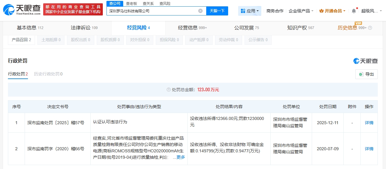雷达财经讯,天眼查天眼风险信息显示,近日,深圳罗马仕科技有限公司因违反强制认证规定、虚假宣传,被深圳市市场监督管理局南山监管局没收违法所得1.2万余元、罚款123万元。