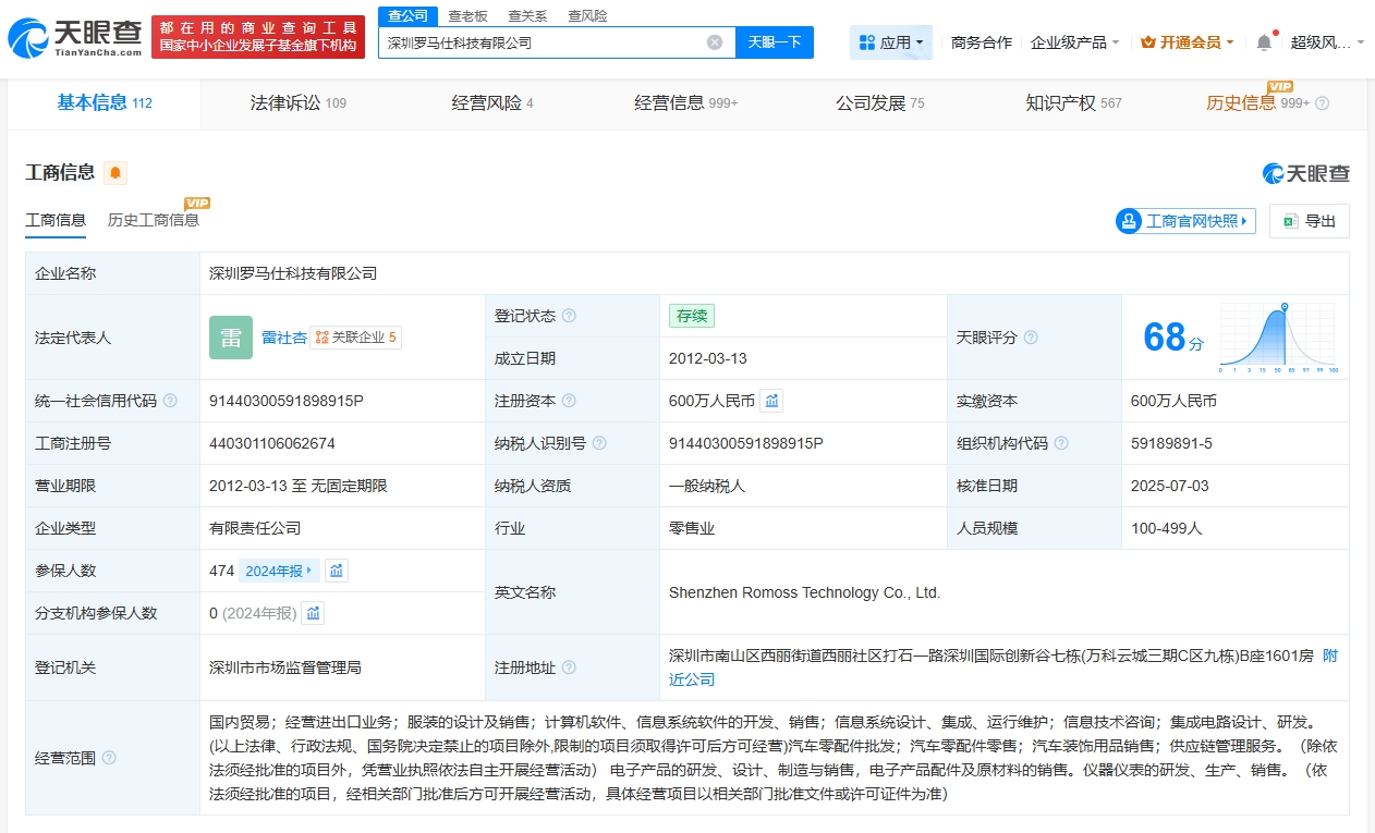 该公司成立于2012年3月,法定代表人为雷社杏,注册资本600万人民币,经营范围包括国内贸易、经营进出口业务、服装的设计及销售等。股东信息显示,该公司由雷桂斌、雷灿伙共同持股。