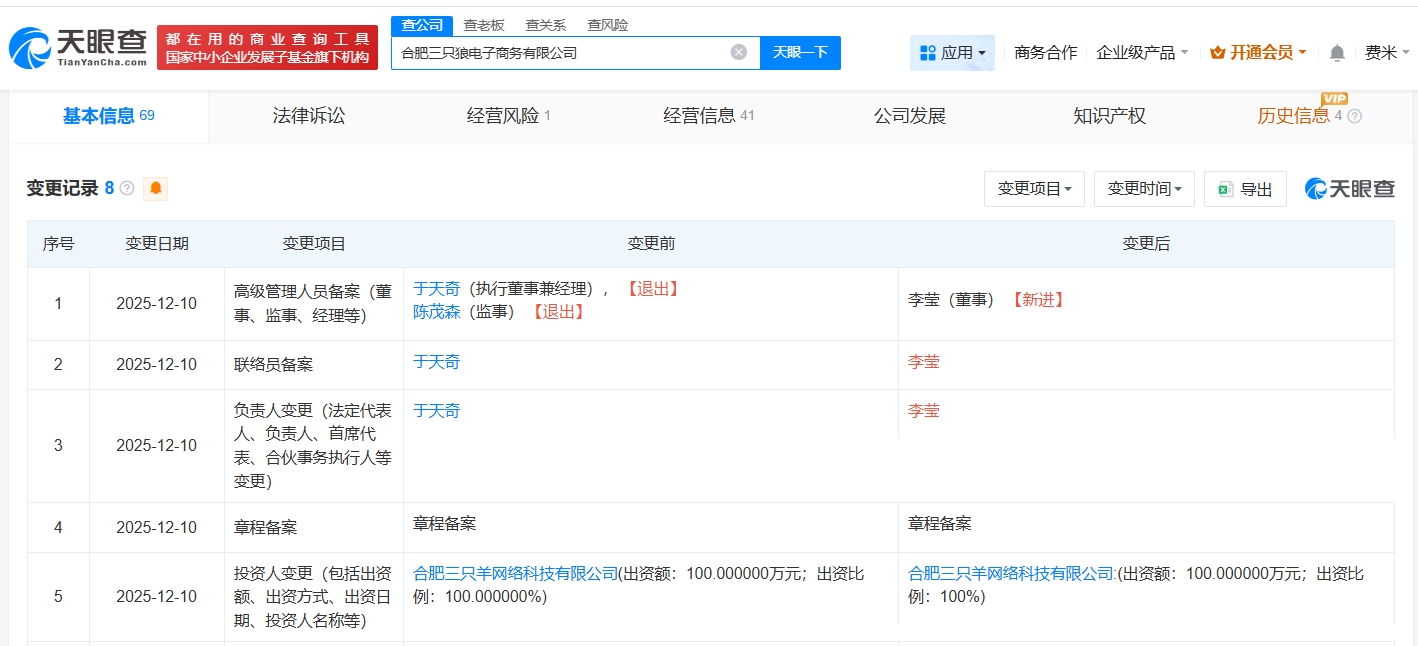 雷达财经讯,天眼查App显示,近日,合肥三只狼电子商务有限公司发生工商变更,于天奇卸任法定代表人、执行董事兼经理,李莹接任法定代表人并担任董事。