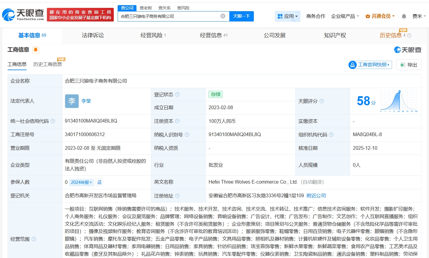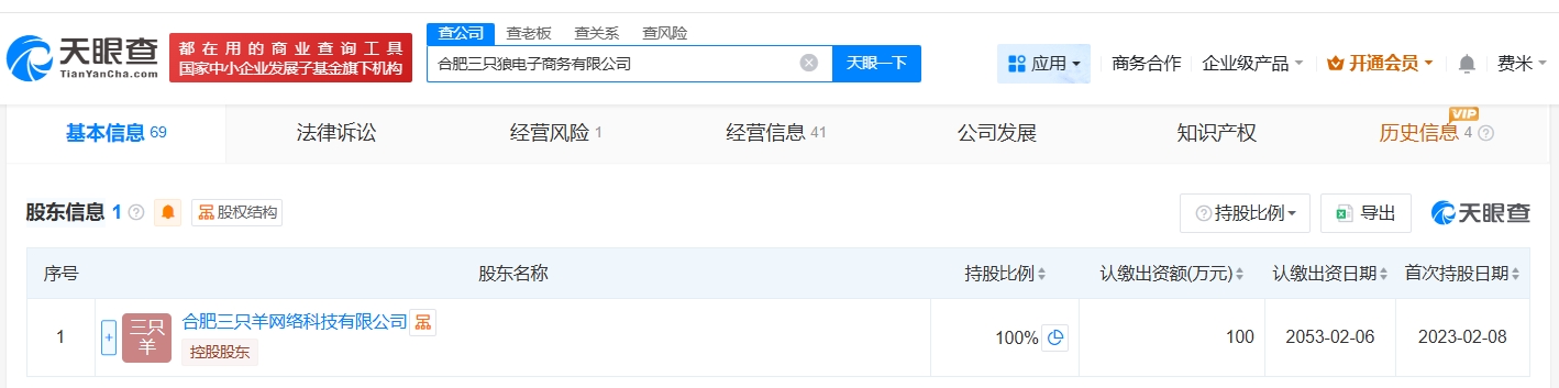 该公司成立于2023年2月,注册资本100万人民币,经营范围包括互联网销售、信息技术咨询服务、软件开发等,由合肥三只羊网络科技有限公司全资持股。