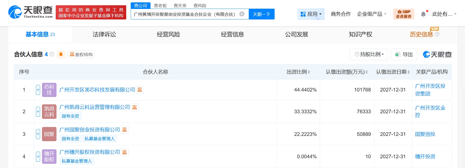 雷达财经讯,天眼查App显示,近日,广州黄埔开投智星创业投资基金合伙企业(有限合伙)成立,执行事务合伙人为广州穗开股权投资有限公司,出资额22.9亿人民币,经营范围为以自有资金从事投资活动,创业投资,以私募基金从事股权投资、投资管理、资产管理等活动。合伙人信息显示,该基金由广州开发区美芯科技发展有限公司、广州凯得云科运营管理有限公司、广州国聚创业投资有限公司、广州穗开股权投资有限公司共同出资。