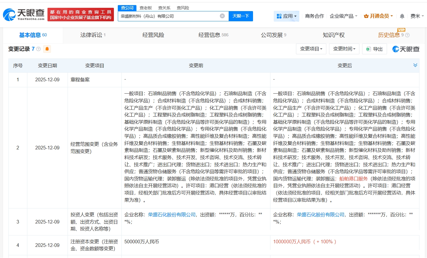 雷达财经讯,天眼查App显示,近日,荣盛新材料(舟山)有限公司发生工商变更,注册资本由50亿人民币增至100亿人民币,增幅100%。