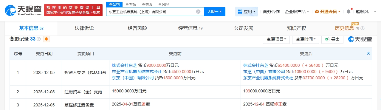 雷达财经讯,天眼查App显示,近日,东芝工业机器系统(上海)有限公司发生工商变更,注册资本由1.5亿日元增至10.9亿日元。