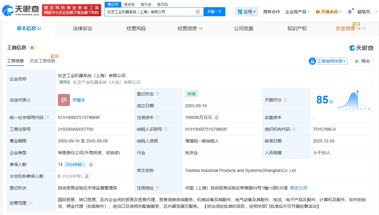该公司成立于2003年9月,法定代表人为伊藤渉,经营范围包括国际贸易、转口贸易、区内企业间的贸易及贸易代理等。股东信息显示,该公司由东芝产业机器系统株式会社、株式会社东芝、东芝(中国)有限公司共同持股。