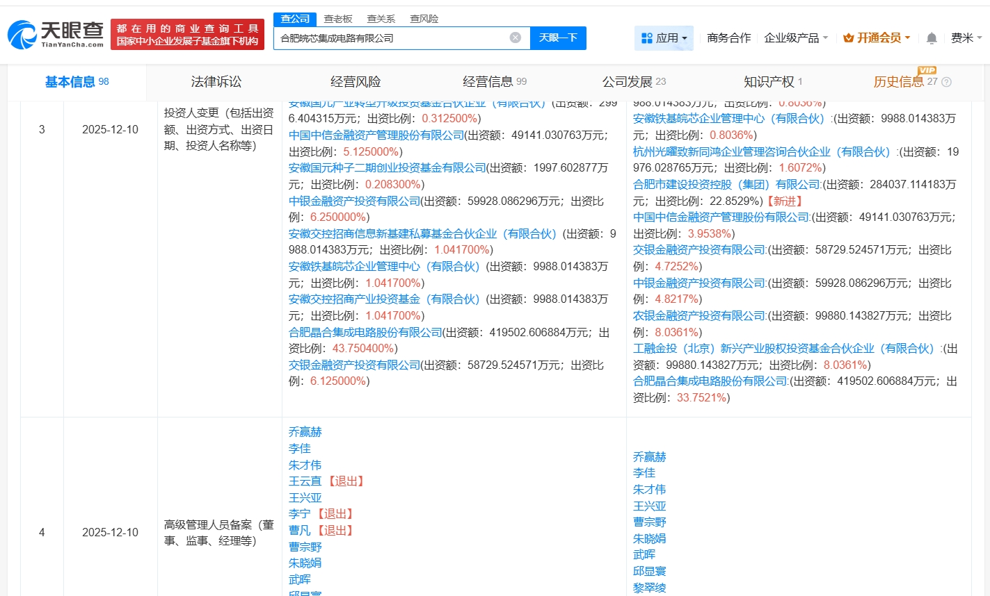 雷达财经讯,天眼查App显示,近日,合肥皖芯集成电路有限公司发生工商变更,新增合肥市建设投资控股(集团)有限公司为股东,同时,注册资本由约95.89亿人民币增至约124.3亿人民币,增幅约30%,同时,部分高管发生变更。