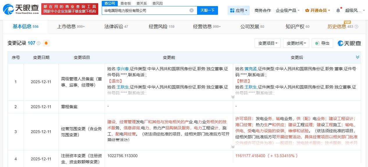 雷达财经讯,天眼查App显示,近日,华电国际(600027)发生工商变更,注册资本由约102亿人民币增至约116亿人民币,增幅约14%,同时部分高管也发生变更。
