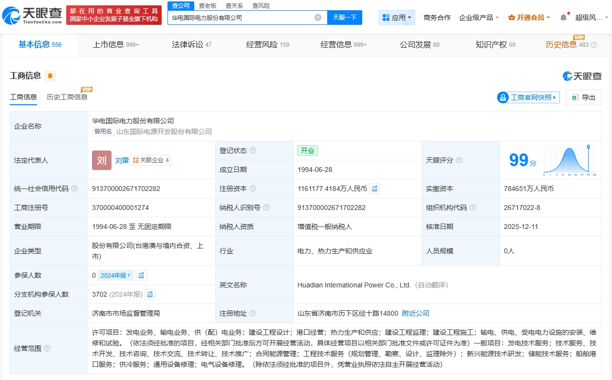 华电国际电力股份有限公司成立于1994年6月,法定代表人为刘雷,经营范围包括发电技术服务、合同能源管理、工程技术服务、新兴能源技术研发等。股东信息显示,该公司由中国华电集团有限公司、香港中央结算有限公司、山东发展投资控股集团有限公司等共同持股。