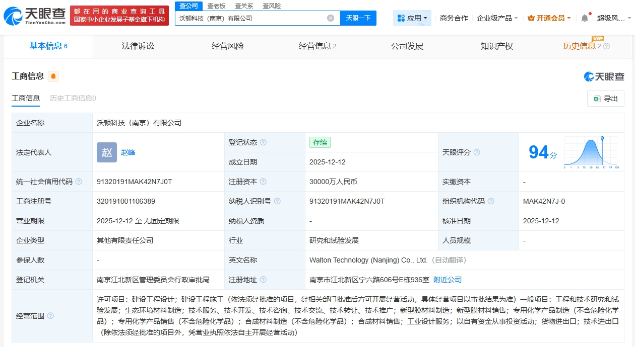 雷达财经讯,天眼查工商信息显示,近日,沃顿科技(南京)有限公司成立,法定代表人为赵峰,注册资本3亿人民币,经营范围包括建设工程设计、建设工程施工、工程和技术研究和试验发展、生态环境材料制造等。股东信息显示,该公司由沃顿科技(000920)全资持股。