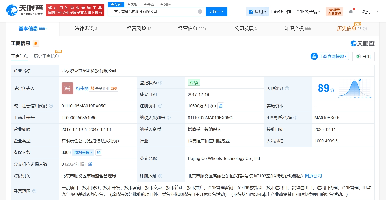 该公司成立于2017年12月,法定代表人为冯伟丽,经营范围为技术服务、技术开发、技术咨询、技术交流、技术转让、技术推广,企业管理咨询,企业形象策划,技术进出口,货物进出口,进出口代理,企业管理,电动汽车充电基础设施运营。股东信息显示,该公司由理想汽车旗下Leading Ideal HK Limited全资持股。