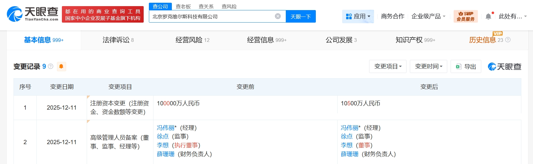 雷达财经讯,天眼查工商信息显示,近日,北京罗克维尔斯科技有限公司发生工商变更,李想由执行董事变更为董事,注册资本由10亿人民币减至1.05亿人民币,降幅89.5%。
