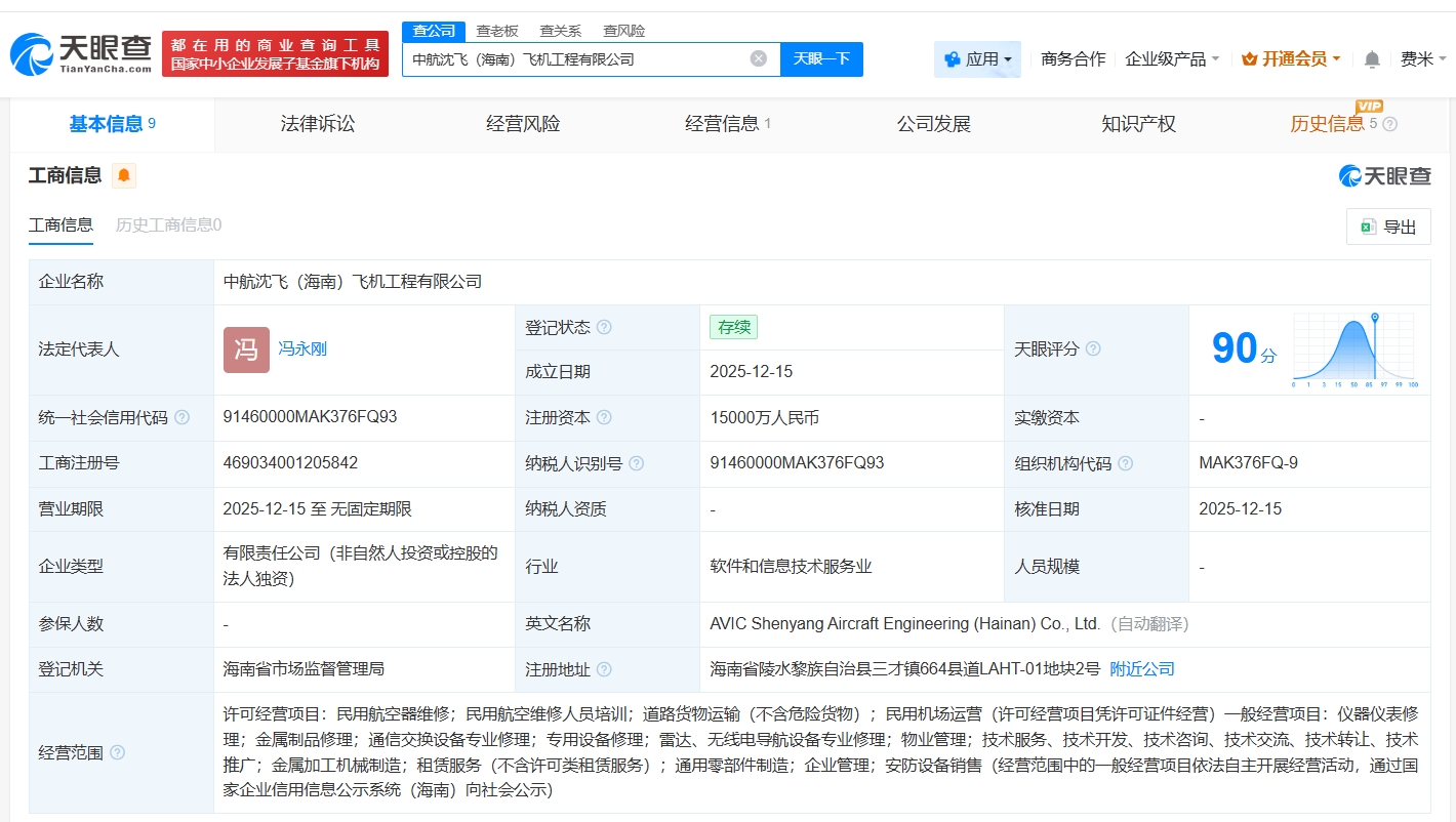 雷达财经讯,天眼查App显示,近日,中航沈飞(海南)飞机工程有限公司成立,法定代表人为冯永刚,注册资本1.5亿人民币,经营范围包括民用航空器维修、民用航空维修人员培训、民用机场运营等,由中航沈飞(600760)旗下沈阳飞机工业(集团)有限公司全资持股。
