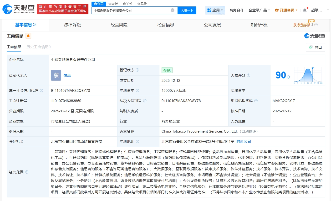 雷达财经讯,天眼查App显示,近日,中烟采购服务有限责任公司成立,法定代表人为蔡喆,注册资本1.5亿人民币,经营范围包括采购代理服务、招投标代理服务、供应链管理服务、工程管理服务等。股东信息显示,该公司由中国烟草投资管理公司全资持股。