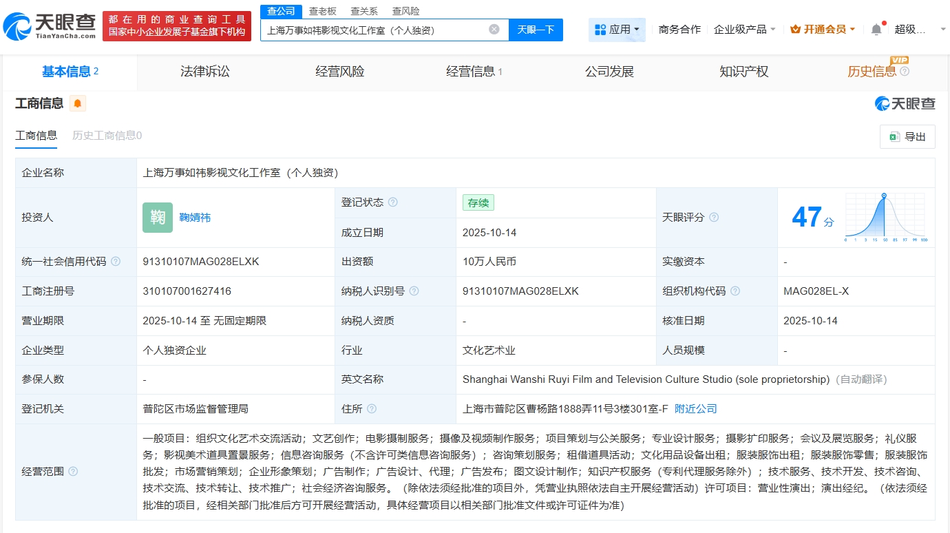 天眼查任职信息显示,鞠婧祎名下关联2家个人独资工作室。其中,上海橘事顺利影视文化工作室(个人独资)成立于2024年12月,出资额5万人民币,经营范围包括组织文化艺术交流活动、文艺创作、文化娱乐经纪人服务等;上海万事如祎影视文化工作室(个人独资)成立于2025年10月,出资额10万人民币,经营范围包括电影摄制服务、营业性演出、演出经纪等。
