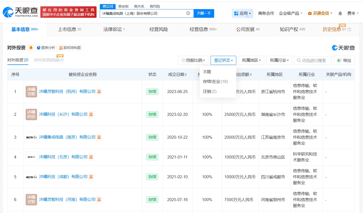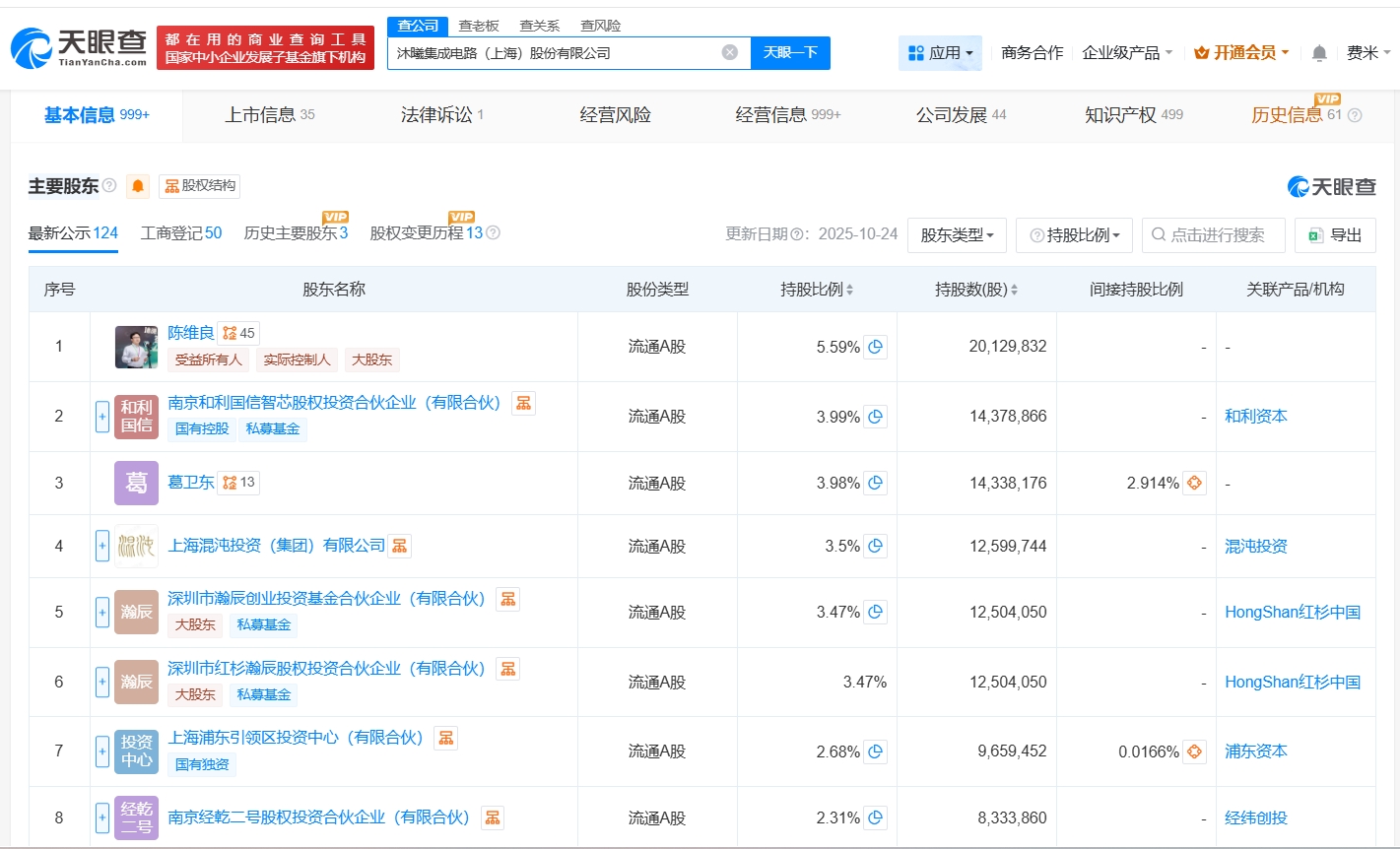 天眼查App显示,沐曦集成电路(上海)股份有限公司成立于2020年9月,法定代表人为陈维良,注册资本3.6亿人民币,经营范围包括集成电路设计、软件开发、电子产品销售等,由陈维良、南京和利国信智芯股权投资合伙企业(有限合伙)、葛卫东等共同持股。对外投资信息显示,该公司对外投资18家存续企业,包括沐曦灵智科技(杭州)有限公司、沐曦科技(长沙)有限公司、沐曦集成电路(南京)有限公司等。