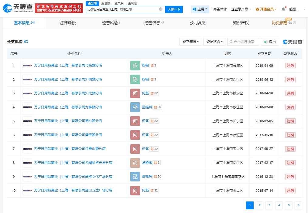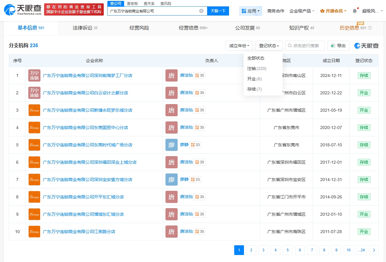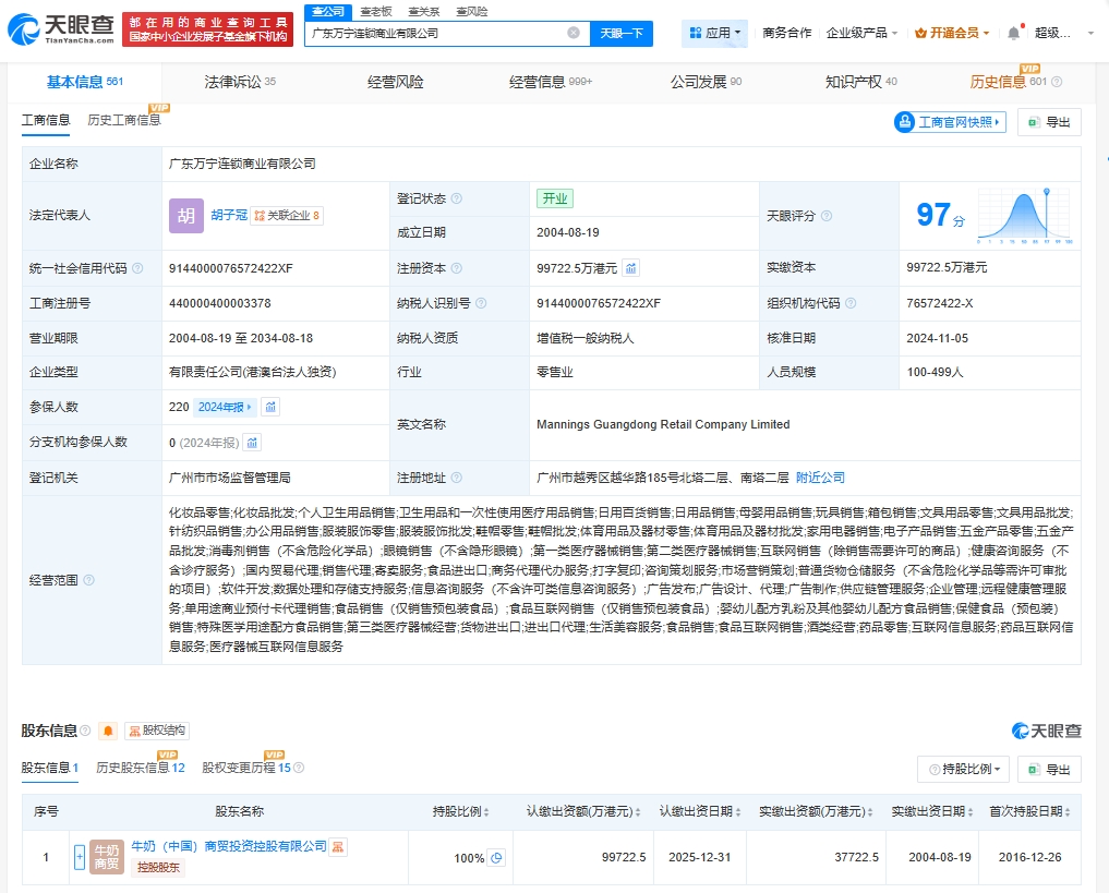 天眼查工商信息显示,万宁关联公司广东万宁连锁商业有限公司成立于2004年8月,法定代表人为胡子冠,注册资本约9.97亿港元,由牛奶(中国)商贸投资控股有限公司全资持股。分支机构信息显示,该公司拥有200余家分店,多为注销状态。