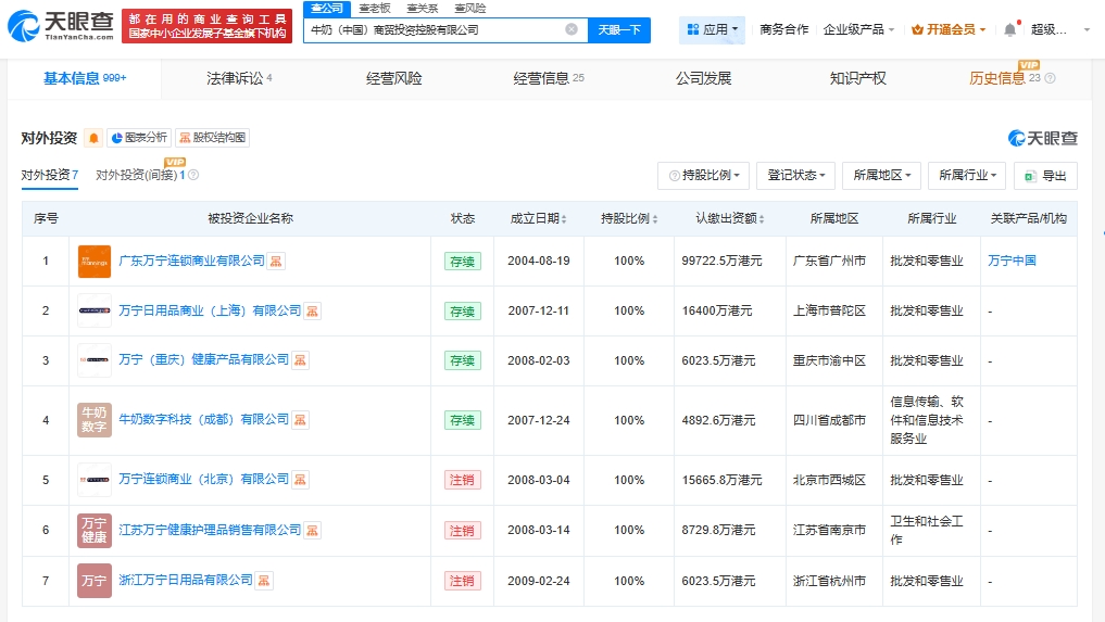 此外,牛奶(中国)商贸投资控股有限公司成立于2016年10月,法定代表人为胡子冠,注册资本约19.07亿港元,由牛奶有限公司全资持股。对外投资信息显示,该公司全资持股7家企业,其中4家为存续状态。值得注意的是,其持股的万宁日用品商业(上海)有限公司、万宁(重庆)健康产品有限公司、牛奶数字科技(成都)有限公司等公司的分支机构均已注销。