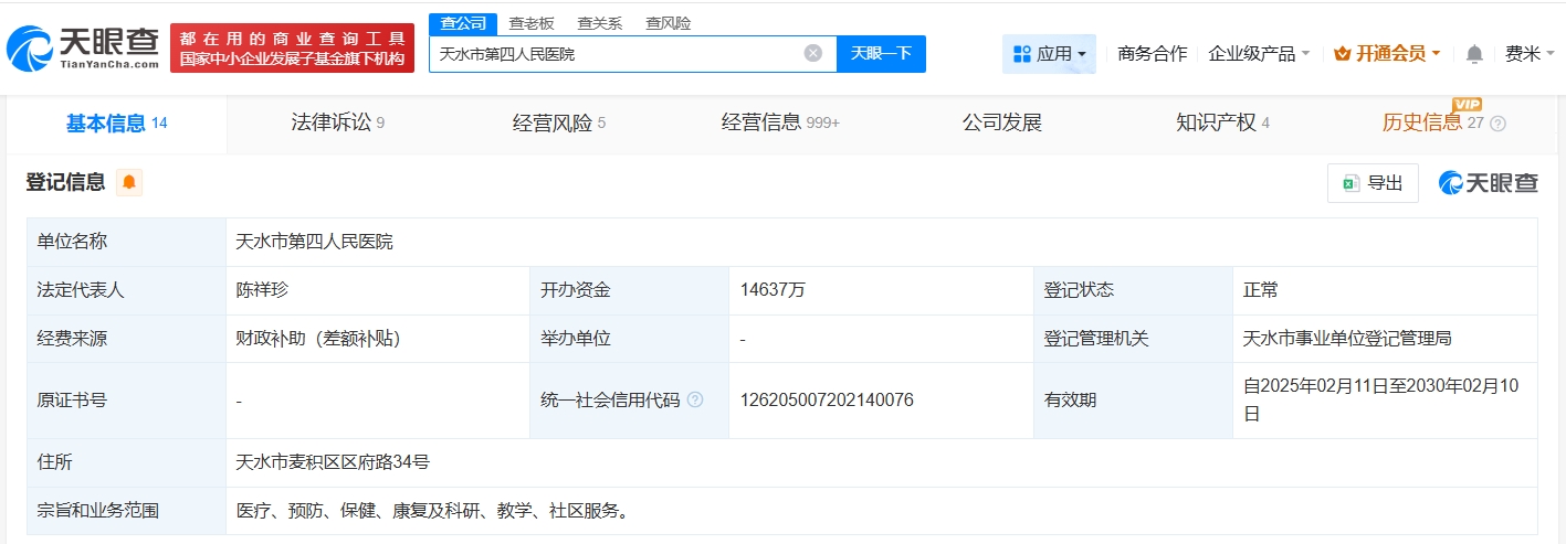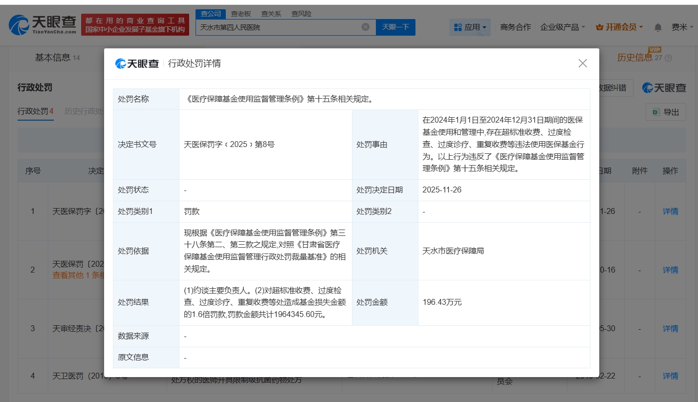 雷达财经讯,天眼查经营风险信息显示,近日,天水市第四人民医院因存在超标准收费、过度检查、过度诊疗、重复收费等违法使用医保基金行为,被天水市医疗保障局罚款196万余元。