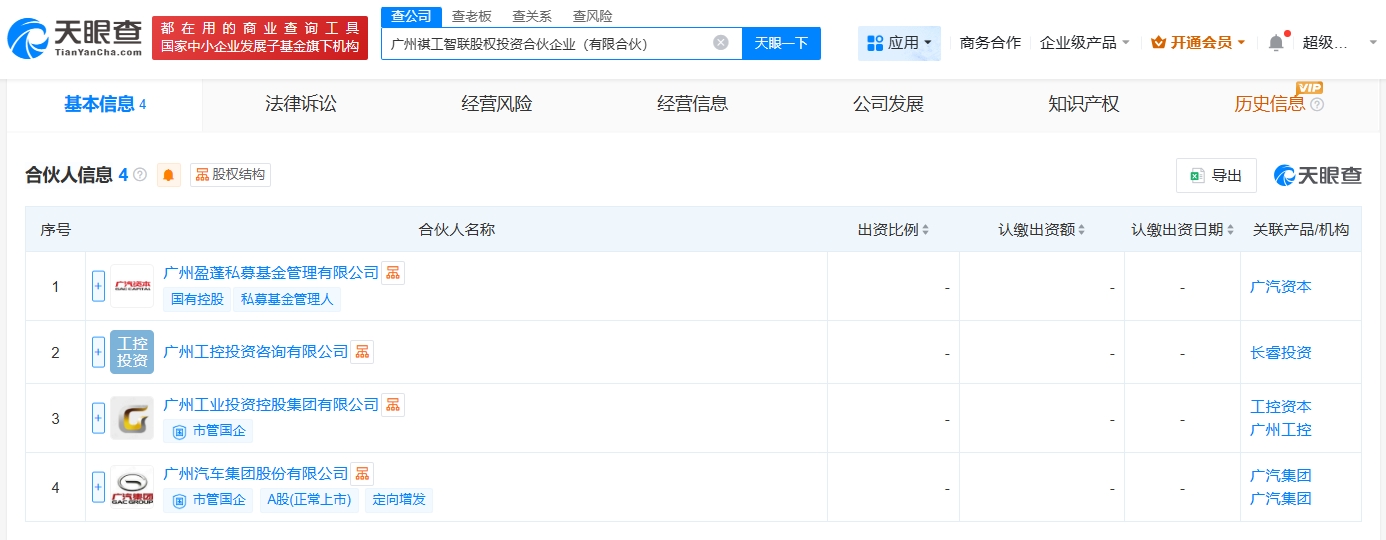 雷达财经讯,天眼查工商信息显示,近日,广州祺工智联股权投资合伙企业(有限合伙)成立,执行事务合伙人为广州盈蓬私募基金管理有限公司,出资额10亿人民币,经营范围包括以自有资金从事投资活动,以私募基金从事股权投资、投资管理、资产管理等活动。合伙人信息显示,该合伙企业由广汽集团(601238)、广州工业投资控股集团有限公司、广州工控投资咨询有限公司、广州盈蓬私募基金管理有限公司共同出资。
