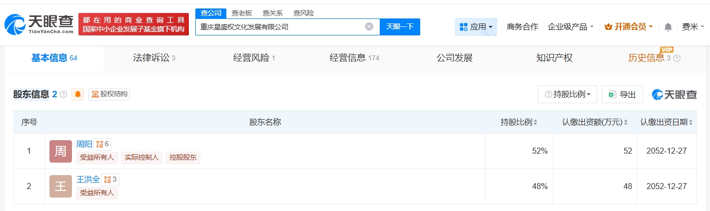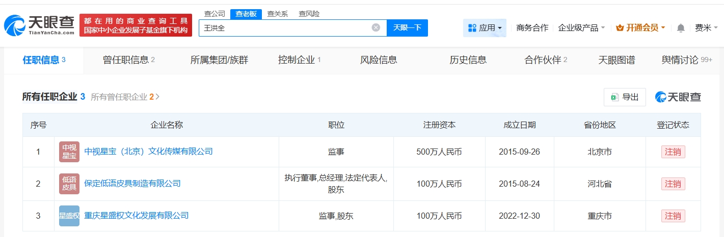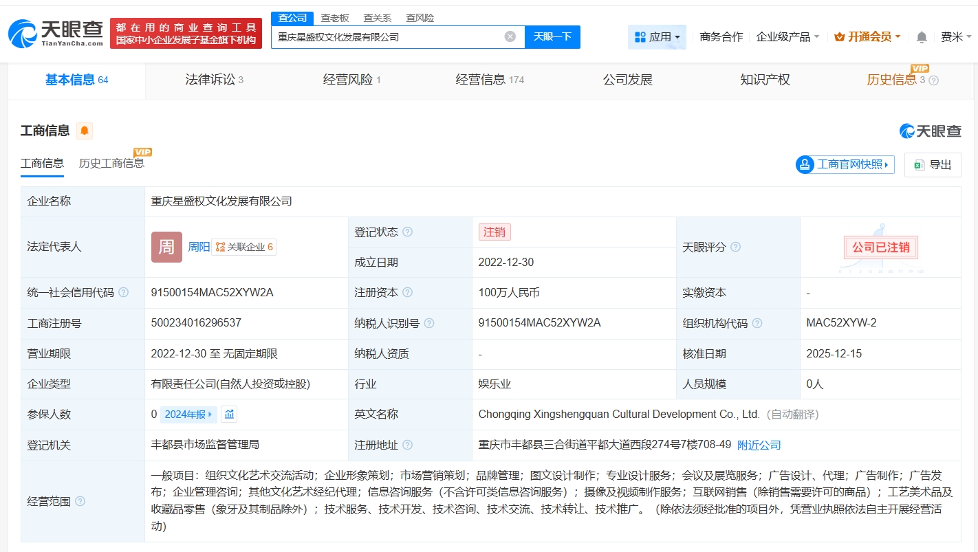 该公司成立于2022年12月,法定代表人为周阳,注册资本100万人民币,经营范围包括组织文化艺术交流活动、企业形象策划、市场营销策划、品牌管理等,由周阳、王洪全(网红王红权星)分别持股52%、48%。值得一提的是,目前,王洪全名下3家企业均已注销。