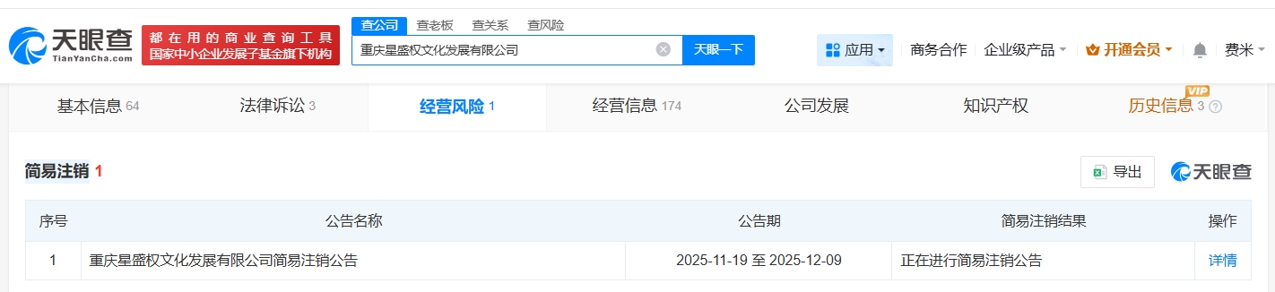 雷达财经讯,天眼查App显示,近日,重庆星盛权文化发展有限公司登记状态由存续变更为注销,此前,该公司已发布简易注销公告。