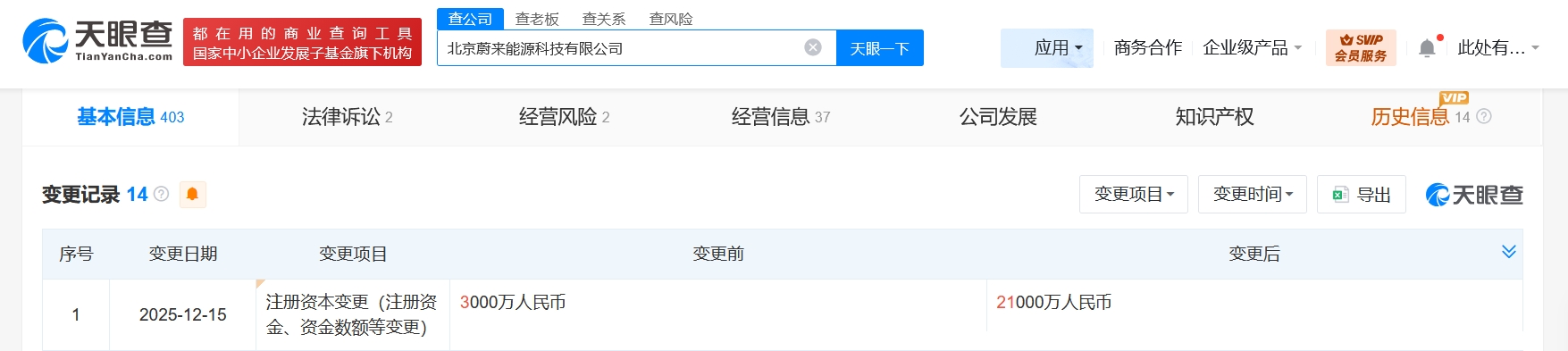 雷达财经讯,天眼查App显示,近日,北京蔚来能源科技有限公司发生工商变更,注册资本由3000万人民币增至2.1亿人民币,增幅600%。