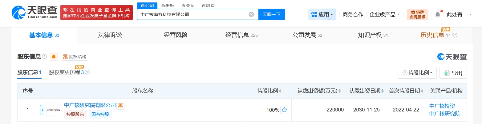 该公司成立于2022年4月,法定代表人为舒睿,经营范围含工程和技术研究和试验发展、软件开发、智能仪器仪表制造、软件销售、计算机软硬件及辅助设备零售、机械设备销售、特殊作业机器人制造等,由中广核研究院有限公司全资持股。