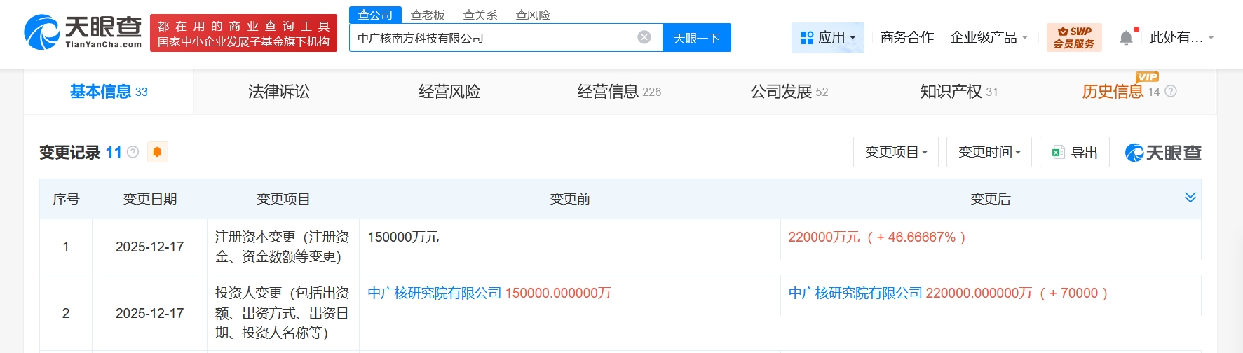 雷达财经讯,天眼查App显示,近日,中广核南方科技有限公司发生工商变更,注册资本由15亿人民币增至22亿人民币,增幅约47%。