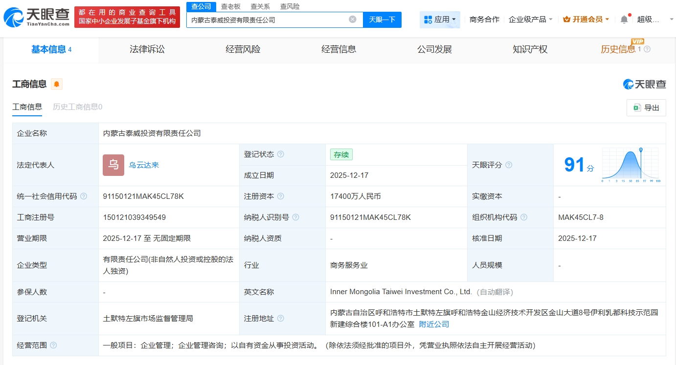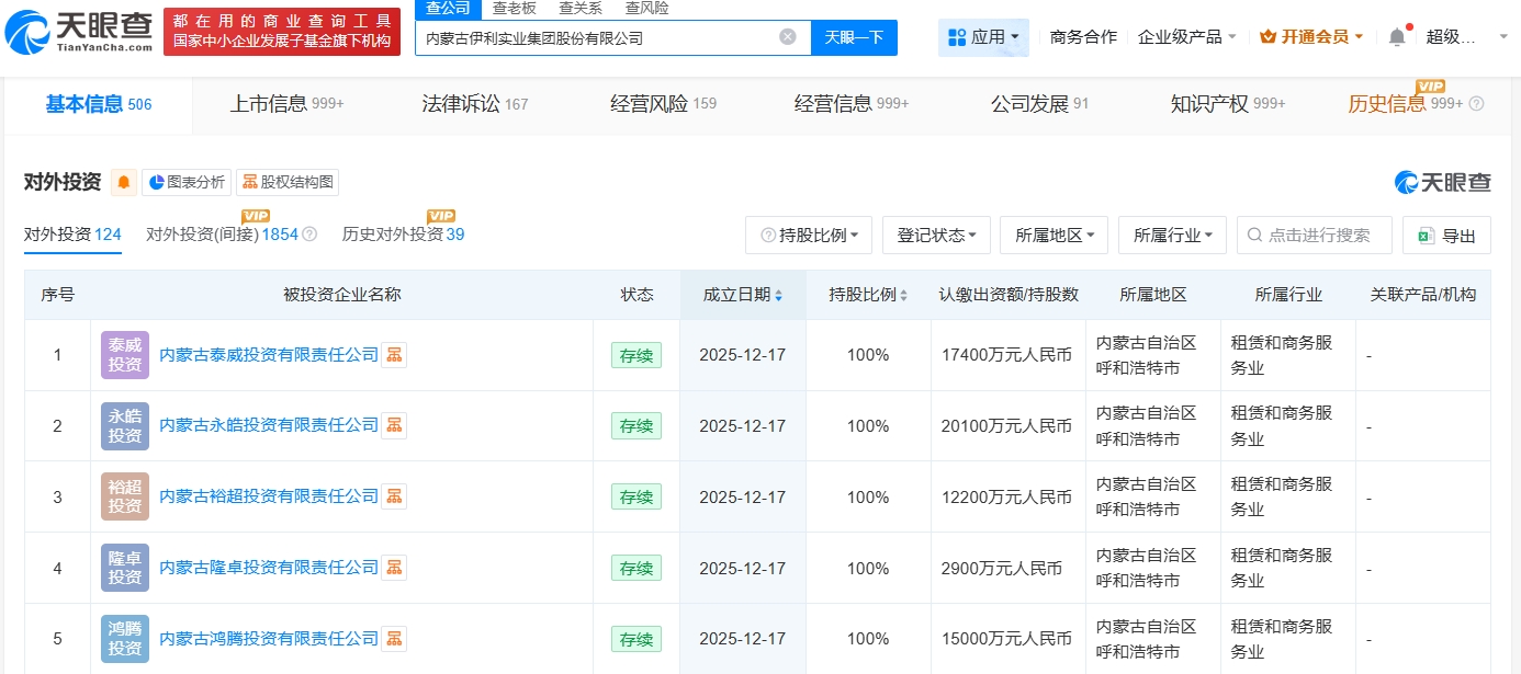雷达财经讯,天眼查工商信息显示,近日,内蒙古永皓投资有限责任公司、内蒙古泰威投资有限责任公司、内蒙古鸿腾投资有限责任公司、内蒙古裕超投资有限责任公司、内蒙古隆卓投资有限责任公司成立,法定代表人均为乌云达来,注册资本分别为2.01亿人民币、1.74亿人民币、1.5亿人民币、1.22亿人民币、2900万人民币,经营范围为企业管理、企业管理咨询、以自有资金从事投资活动。股东信息显示,上述公司均由伊利股份(600887)全资持股。