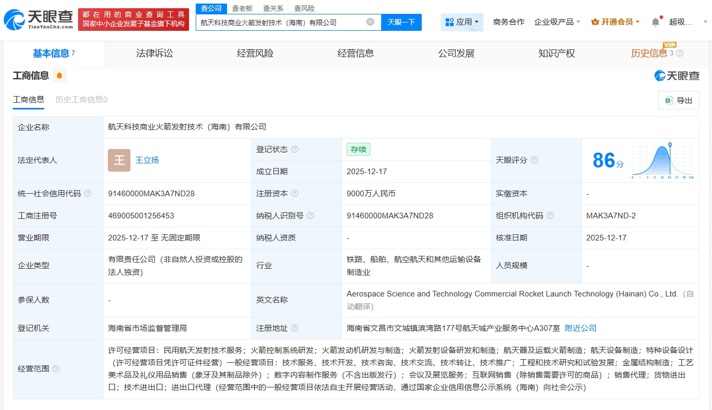 雷达财经讯,天眼查工商信息显示,近日,航天科技商业火箭发射技术(海南)有限公司成立,法定代表人为王立扬,注册资本9000万人民币,经营范围包括民用航天发射技术服务、火箭控制系统研发、火箭发动机研发与制造等。股东信息显示,该公司由中国航天科技集团商业火箭有限公司全资持股。