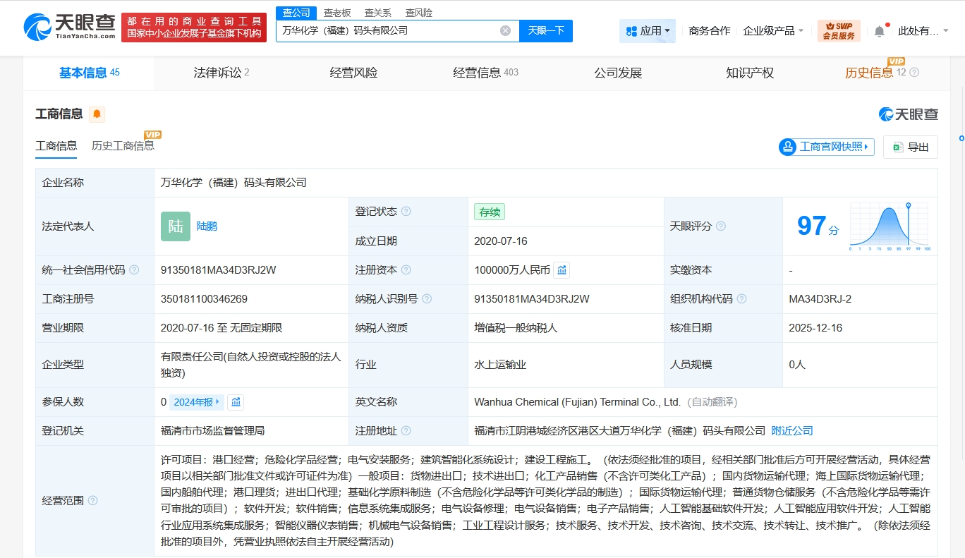 该公司成立于2020年7月,法定代表人为陆鹏,经营范围含港口经营、危险化学品经营、电气安装服务、建筑智能化系统设计、货物进出口、国内货物运输代理、进出口代理、基础化学原料制造、人工智能基础软件开发等,由万华化学(600309)旗下万华化学(福建)有限公司全资持股。