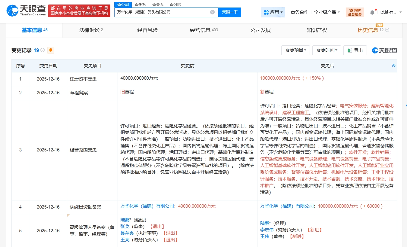 雷达财经讯,天眼查App显示,近日,万华化学(福建)码头有限公司发生工商变更,注册资本由4亿人民币增至10亿人民币,同时,部分高管也发生变更。
