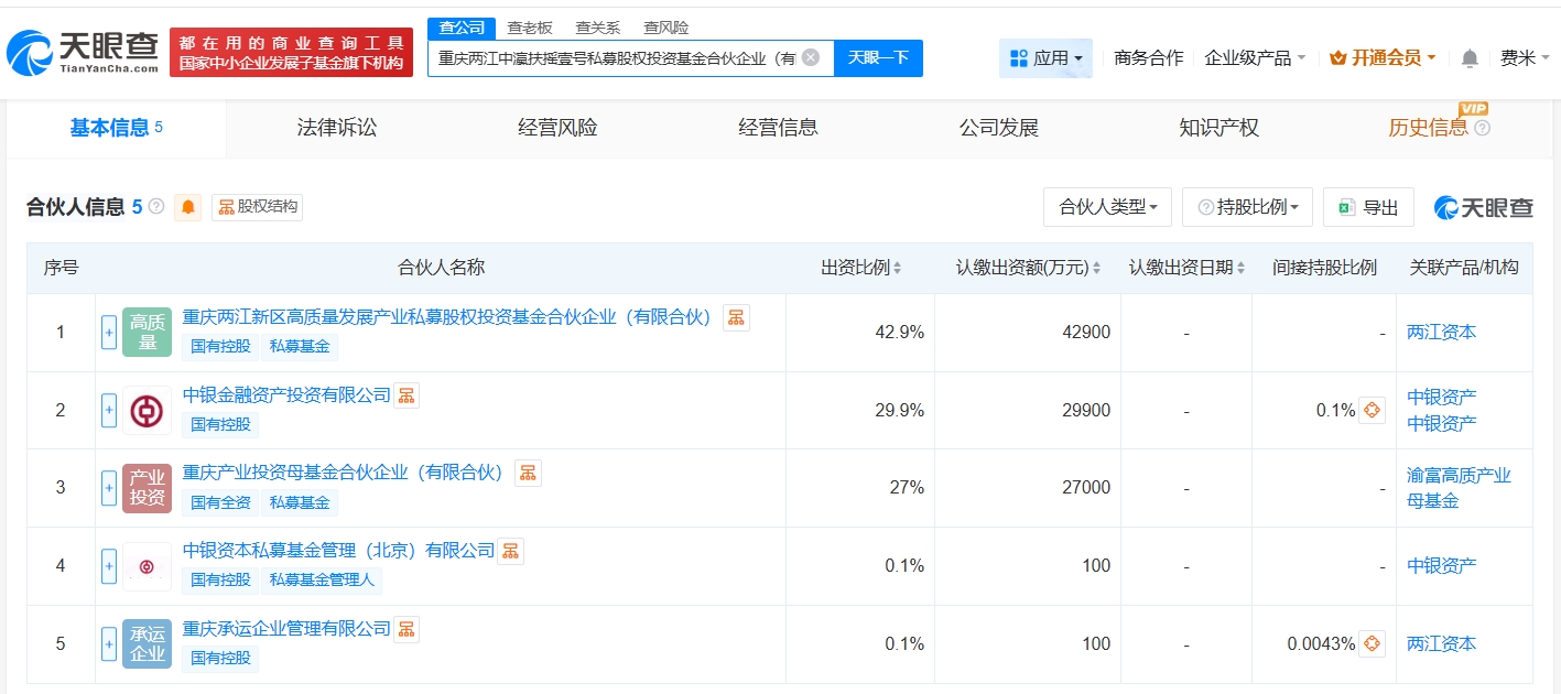 雷达财经讯,天眼查App显示,近日,重庆两江中瀛扶摇壹号私募股权投资基金合伙企业(有限合伙)成立,执行事务合伙人为重庆承运企业管理有限公司、中银资本私募基金管理(北京)有限公司,出资额10亿人民币,经营范围为以私募基金从事股权投资,由重庆两江新区高质量发展产业私募股权投资基金合伙企业(有限合伙)、中银金融资产投资有限公司、中银资本私募基金管理(北京)有限公司等共同出资。