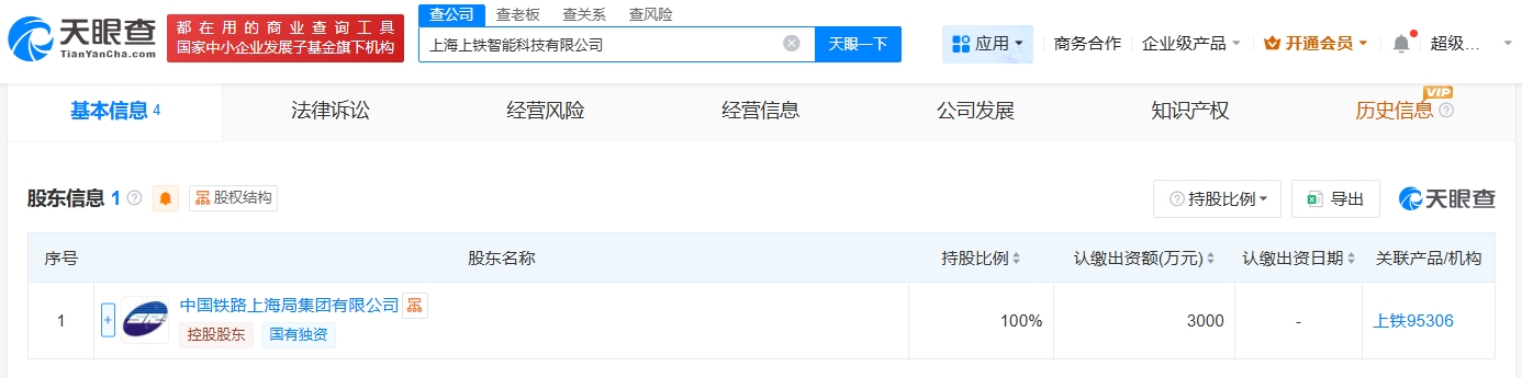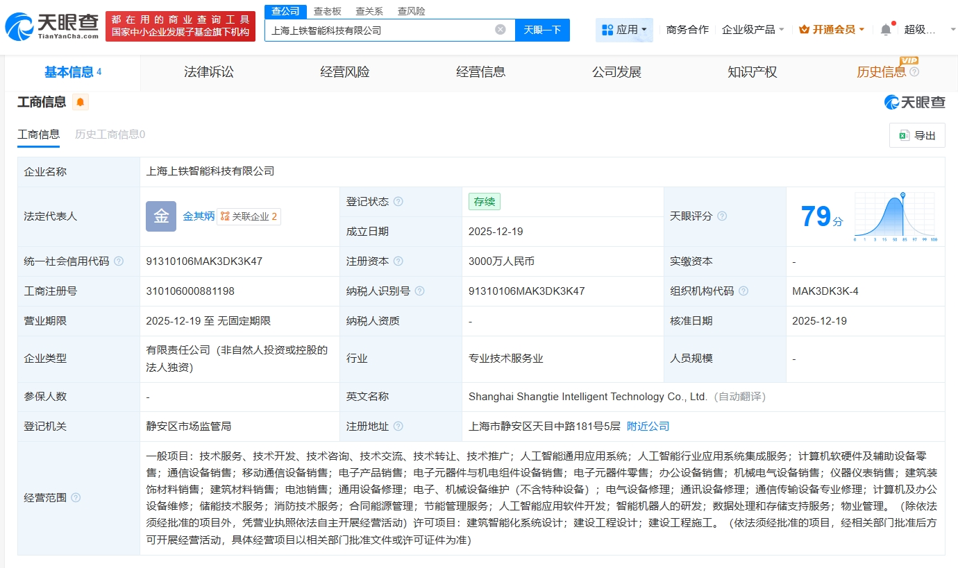 雷达财经讯,天眼查工商信息显示,12月19日,上海上铁智能科技有限公司成立,法定代表人为金其炳,注册资本3000万人民币,经营范围包括人工智能通用应用系统、计算机软硬件及辅助设备零售、储能技术服务、智能机器人的研发等。股东信息显示,该公司由中国铁路上海局集团有限公司全资持股。