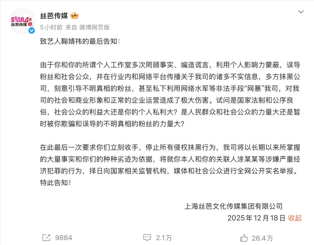 12月18日,丝芭传媒发布《最后告知》,措辞严厉,指责鞠婧祎方编造谎言、误导公众并发起“网络暴力”,要求其立即停止所有所谓“侵权”行为。公司更表示,将择日实名举报鞠婧祎及其关联人涉嫌“严重经济犯罪”,使得纠纷性质骤然严峻。