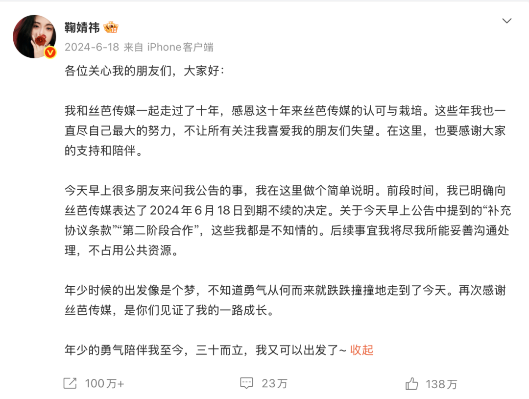 2024年6月18日,丝芭传媒发声明称,与鞠婧祎已进入“第二阶段合作协议”,暗示合约延续。