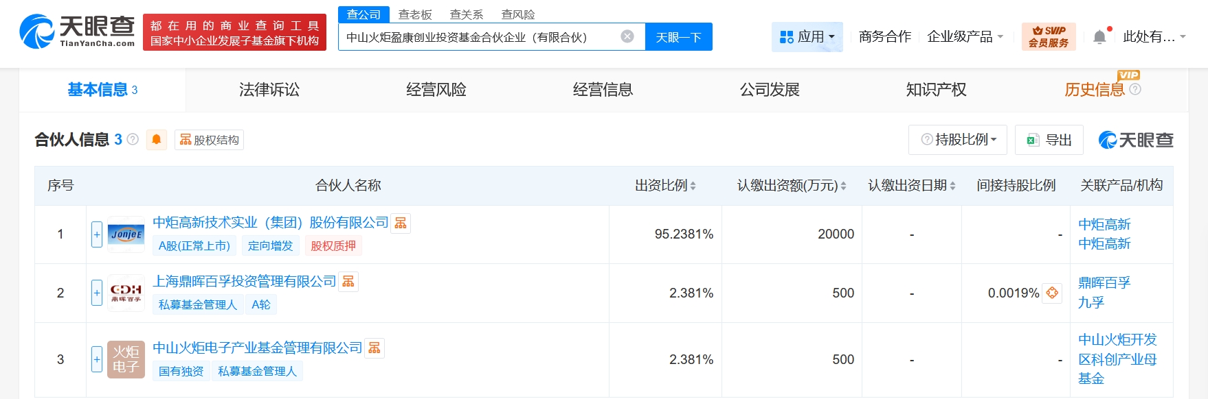 雷达财经讯,天眼查App显示,近日,中山火炬盈康创业投资基金合伙企业(有限合伙)成立,执行事务合伙人为中山火炬电子产业基金管理有限公司,出资额2.1亿人民币,经营范围含私募股权投资基金管理、创业投资基金管理服务,以私募基金从事股权投资、投资管理、资产管理等活动,企业管理咨询。合伙人信息显示,该基金由中炬高新(600872)、上海鼎晖百孚投资管理有限公司、中山火炬电子产业基金管理有限公司共同出资。