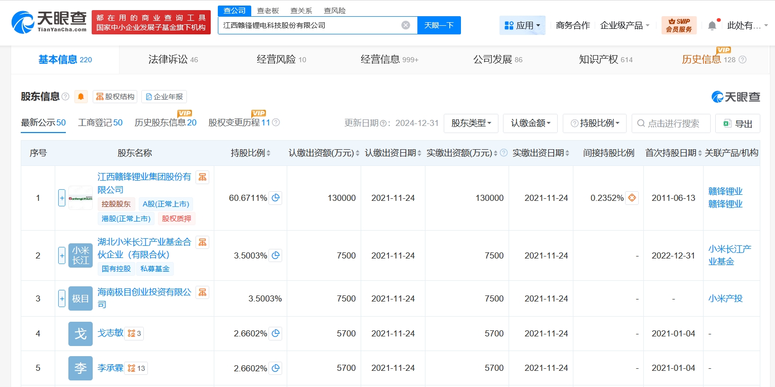 该公司成立于2011年6月,法定代表人为肖海燕,经营范围含锂离子动力电池、燃料电池、储能电池的研发、生产和销售,超级电容器、电池管理系统、风光电储能系统、相关设备仪器的研发、生产和销售,锂电工业设计服务等。股东信息显示,该公司由赣锋锂业(002460)、湖北小米长江产业基金合伙企业(有限合伙)、海南极目创业投资有限公司等共同持股。