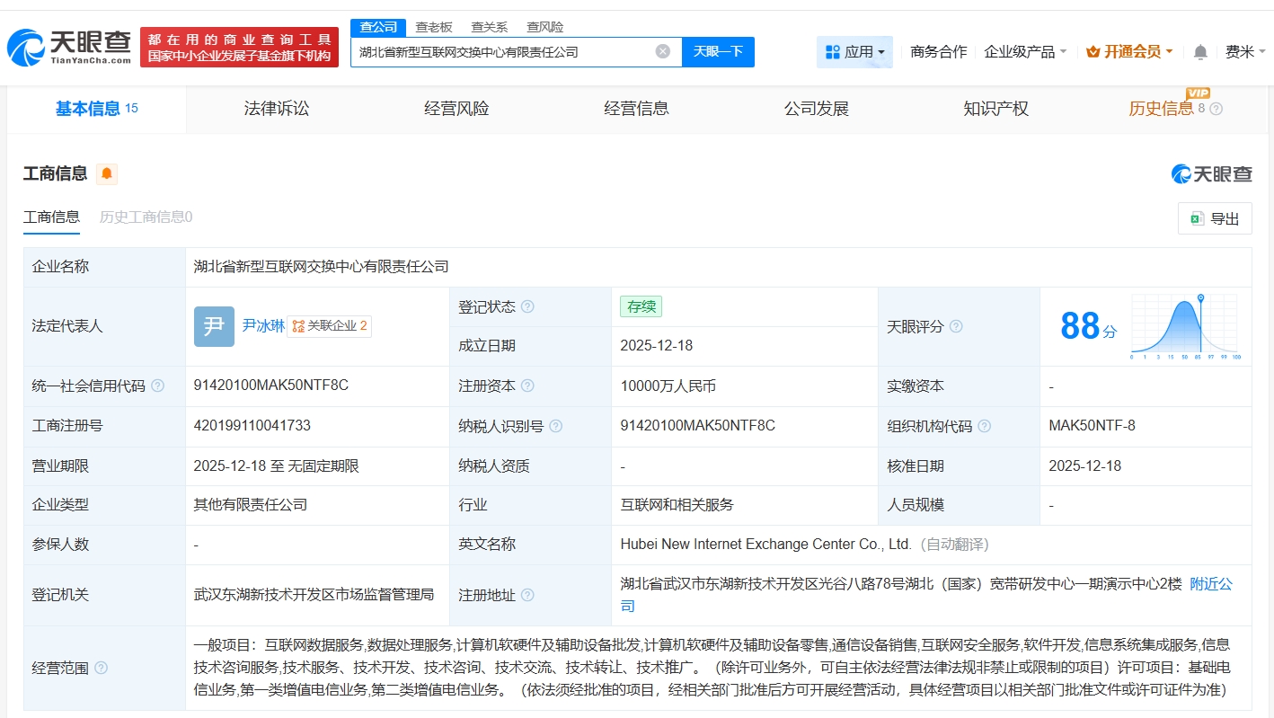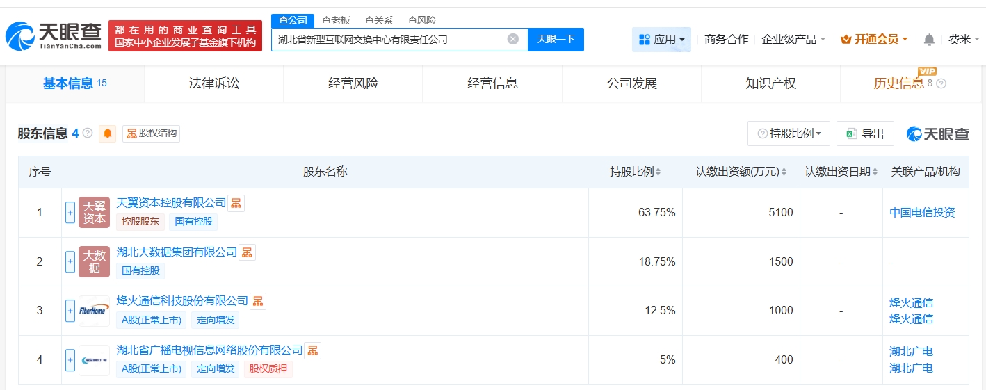 雷达财经讯,天眼查App显示,近日,湖北省新型互联网交换中心有限责任公司成立,法定代表人为尹冰琳,注册资本1亿人民币,经营范围包括互联网数据服务、数据处理服务、计算机软硬件及辅助设备批发、计算机软硬件及辅助设备零售等,由中国电信(601728)旗下天翼资本控股有限公司、湖北大数据集团有限公司、烽火通信(600498)、湖北广电(000665)共同持股。