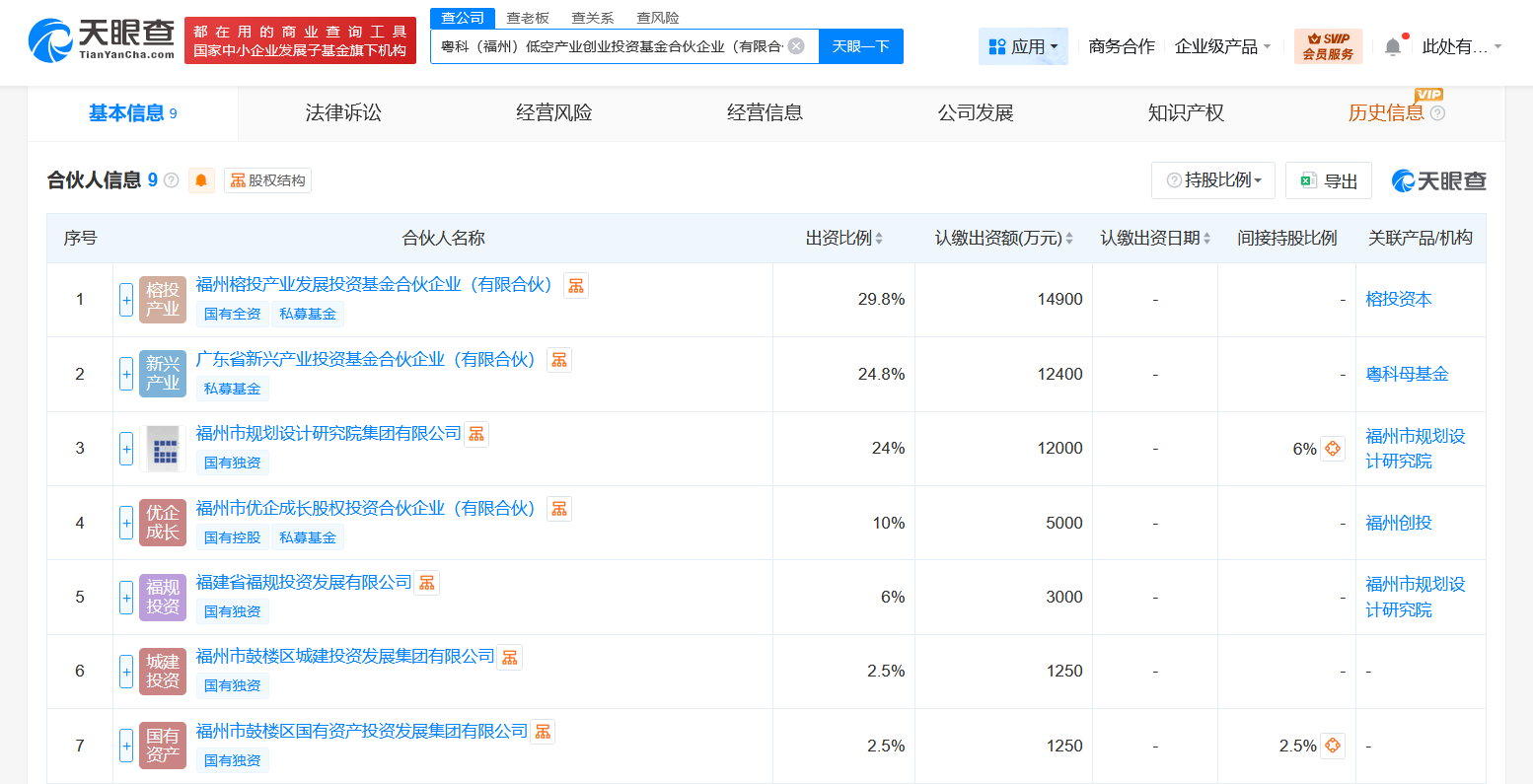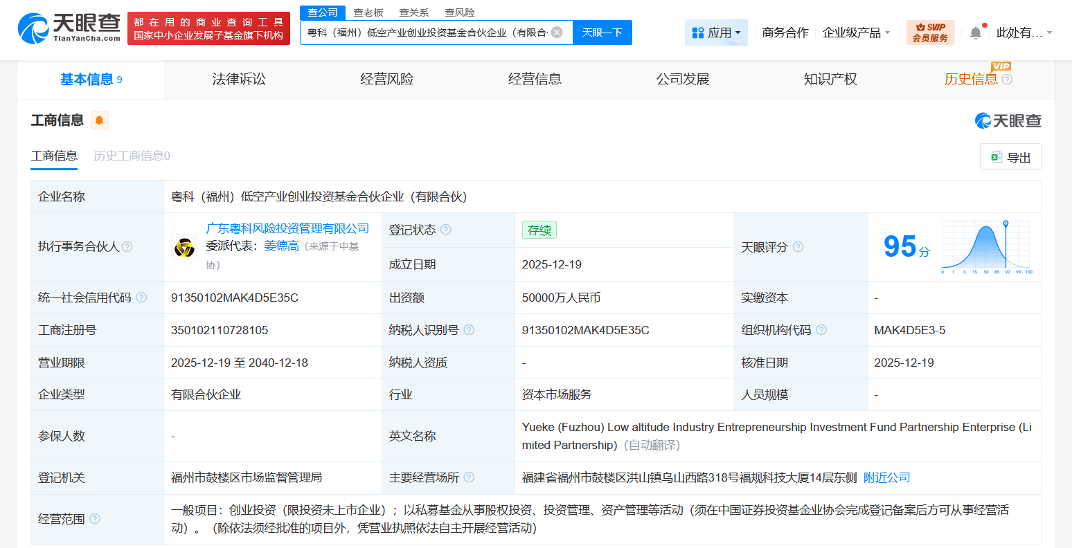 雷达财经讯,天眼查App显示,近日,粤科(福州)低空产业创业投资基金合伙企业(有限合伙)成立,执行事务合伙人为广东粤科风险投资管理有限公司,出资额5亿人民币,经营范围为创业投资,以私募基金从事股权投资、投资管理、资产管理等活动。合伙人信息显示,该基金由福州国资集团旗下福州榕投产业发展投资基金合伙企业(有限合伙)、广东省新兴产业投资基金合伙企业(有限合伙)、福州市规划设计研究院集团有限公司等共同出资。