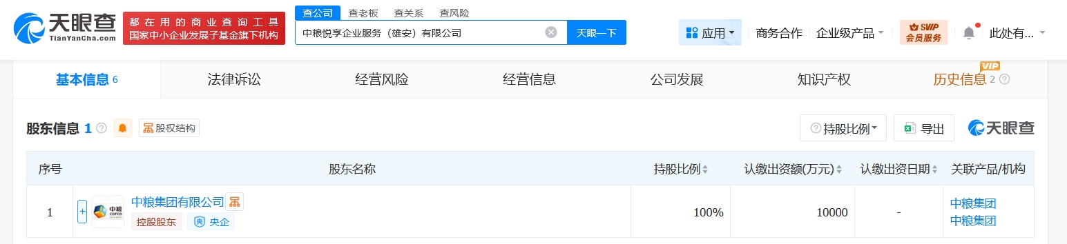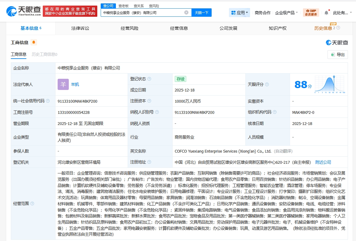 雷达财经讯,天眼查App显示,近日,中粮悦享企业服务(雄安)有限公司成立,法定代表人为羊凯,注册资本1亿人民币,经营范围含企业管理咨询、信息技术咨询服务、互联网销售、社会经济咨询服务、市场营销策划、日用百货销售、计算机软硬件及辅助设备零售等,由中粮集团有限公司全资持股。