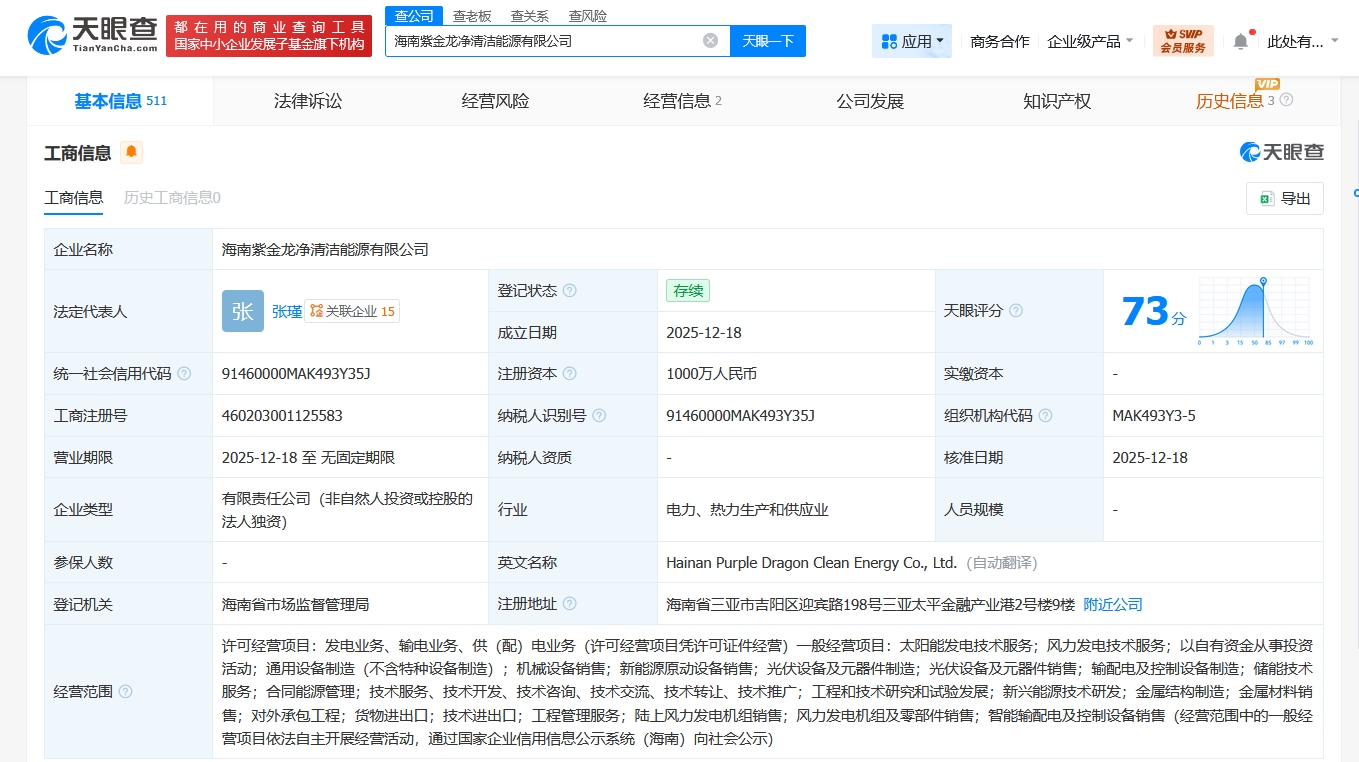 雷达财经讯,天眼查App显示,近日,海南紫金龙净清洁能源有限公司成立,法定代表人为张瑾,注册资本1000万人民币,经营范围含发电业务、输电业务、供(配)电业务,太阳能发电技术服务,风力发电技术服务,以自有资金从事投资活动,通用设备制造,机械设备销售,新能源原动设备销售,光伏设备及元器件制造等,由龙净环保(600388)全资持股。