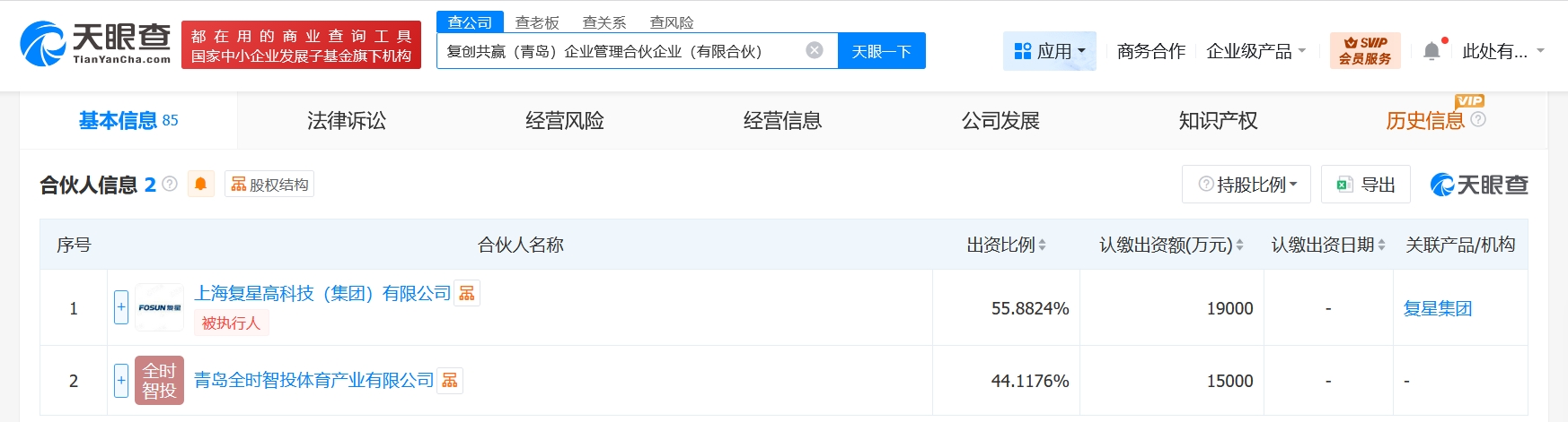 雷达财经讯,天眼查App显示,近日,复创共赢(青岛)企业管理合伙企业(有限合伙)成立,执行事务合伙人为上海复星高科技(集团)有限公司,出资额3.4亿人民币,经营范围为企业管理。合伙人信息显示,该合伙企业由复星国际旗下上海复星高科技(集团)有限公司、青岛全时智投体育产业有限公司共同出资。
