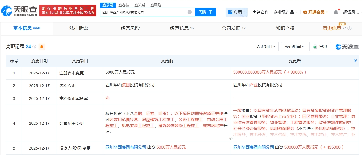 雷达财经讯,天眼查工商信息显示,近日,四川华西集团投资有限公司发生工商变更,企业名称变更为四川华西产业投资有限公司,注册资本由5000万人民币增至50亿人民币,增幅9900%。