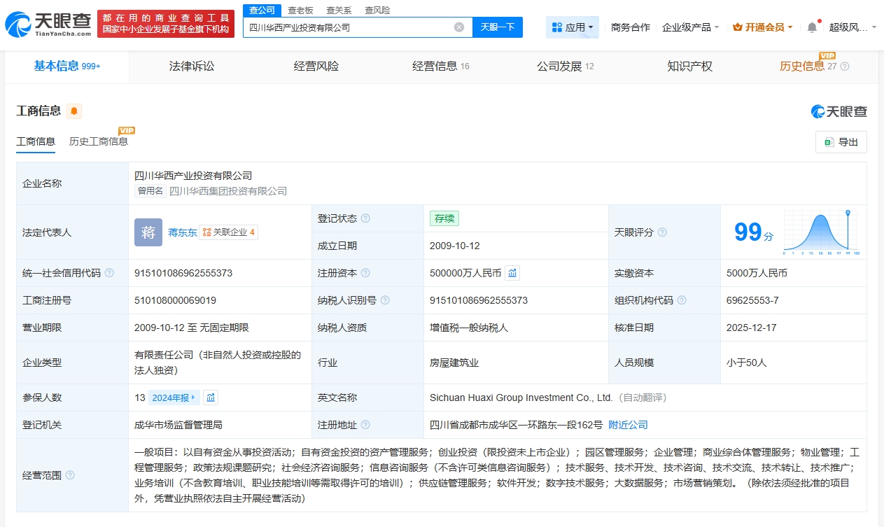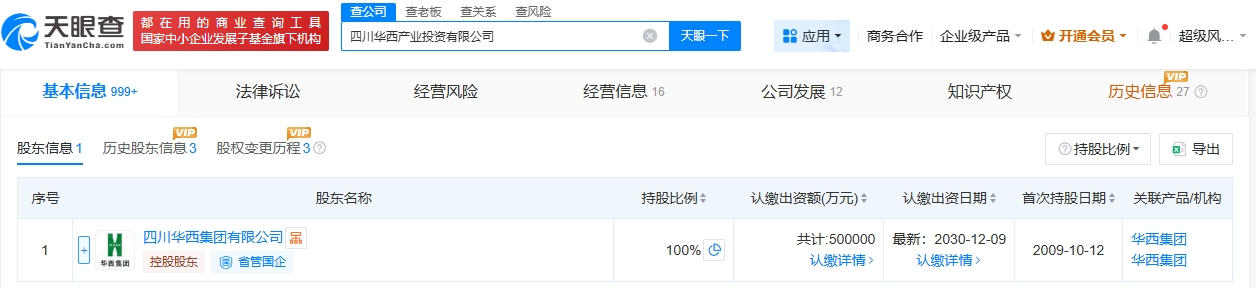 该公司成立于2009年10月,法定代表人为蒋东东,经营范围包括以自有资金从事投资活动、自有资金投资的资产管理服务、创业投资等。股东信息显示,该公司由四川华西集团有限公司全资持股。