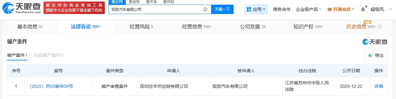 雷达财经讯,天眼查天眼风险信息显示,12月22日,观致汽车有限公司新增一则破产审查案件,申请人为深圳欣本供应链有限公司,经办法院为江苏省苏州市中级人民法院。