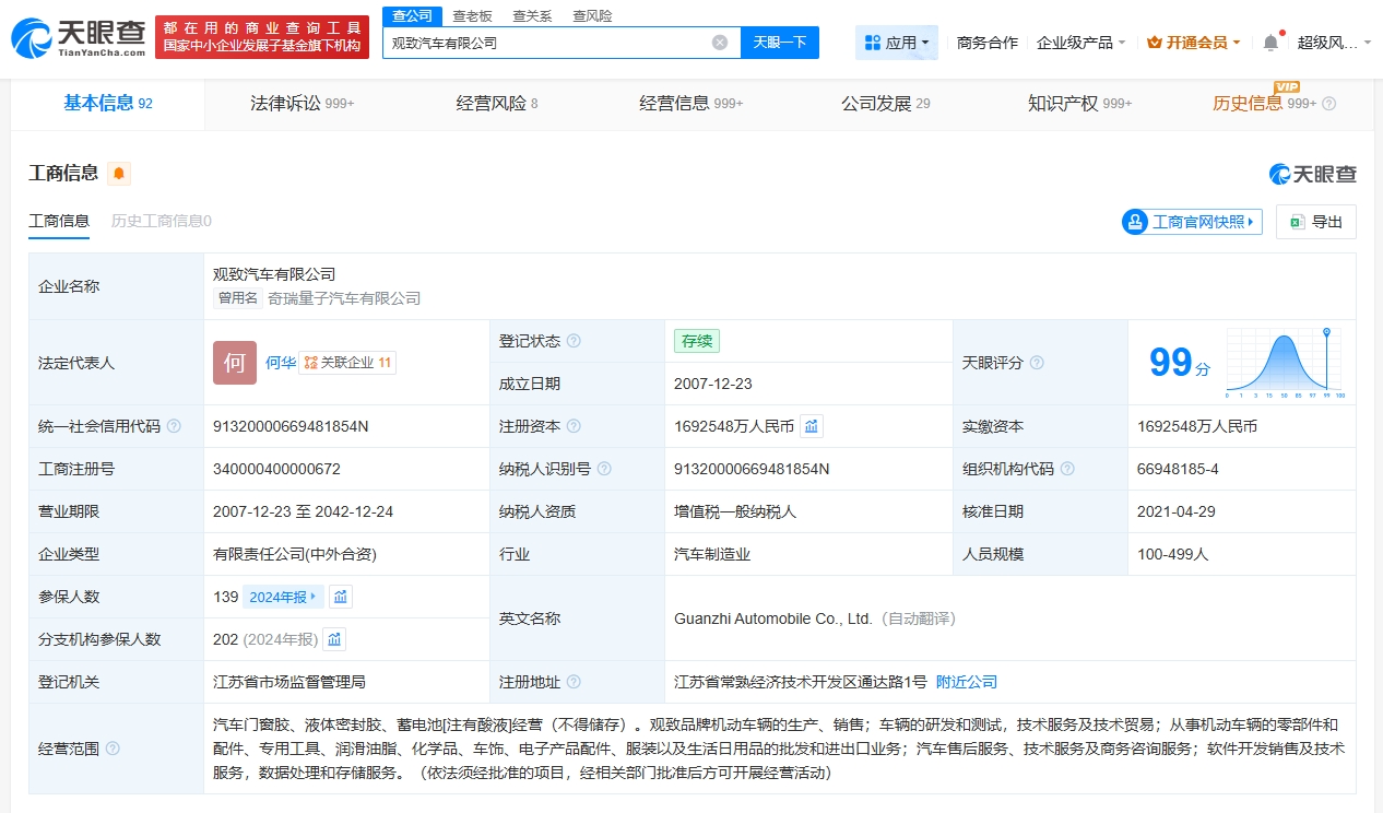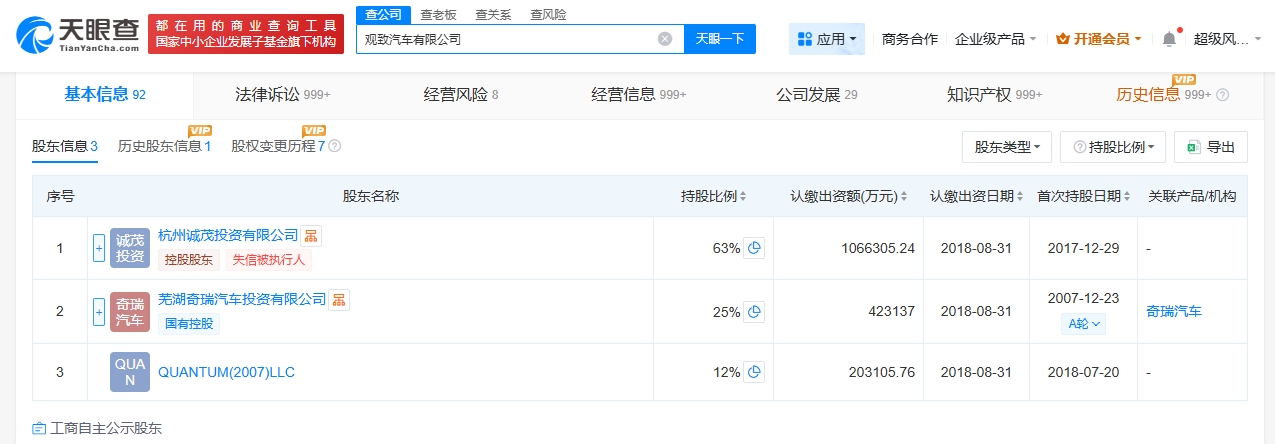 观致汽车有限公司成立于2007年12月,法定代表人为何华,注册资本约169亿人民币,经营范围包括观致品牌机动车辆的生产、销售等。股东信息显示,该公司由杭州诚茂投资有限公司、芜湖奇瑞汽车投资有限公司、QUANTUM(2007)LLC共同持股。