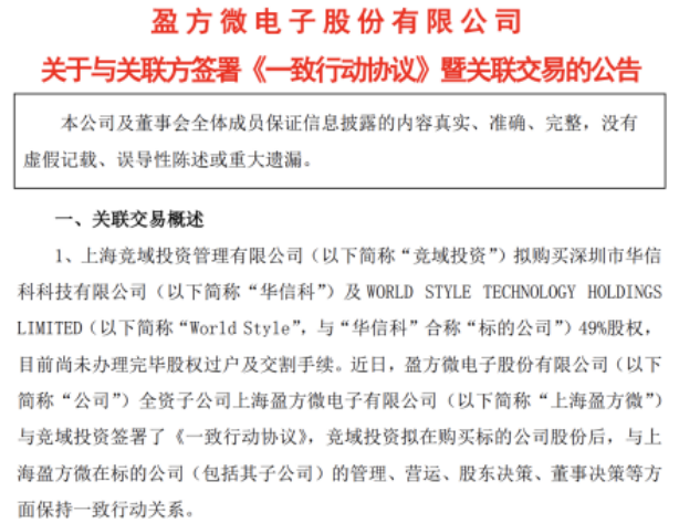 2025年3月,为巩固对华信科和World Style的控制权,盈方微全资子公司上海盈方微与竞域投资签署《一致行动协议》,竞域投资拟在购买华信科及World Style 49%股权后,与上海盈方微保持一致行动关系。