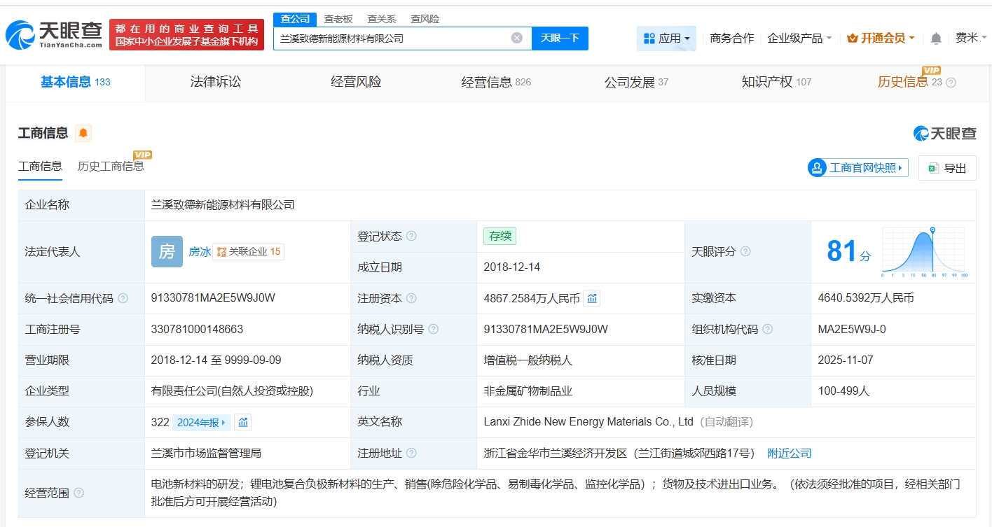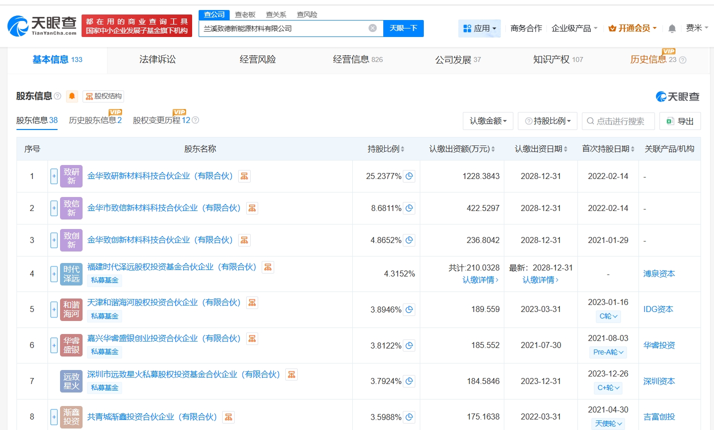 兰溪致德新能源材料有限公司成立于2018年12月,法定代表人为房冰,经营范围为电池新材料的研发,锂电池复合负极新材料的生产与销售,货物及技术进出口业务。股东信息显示,该公司现由金华致研新材料科技合伙企业(有限合伙)、金华市致信新材料科技合伙企业(有限合伙)及上述新增股东等共同持股。