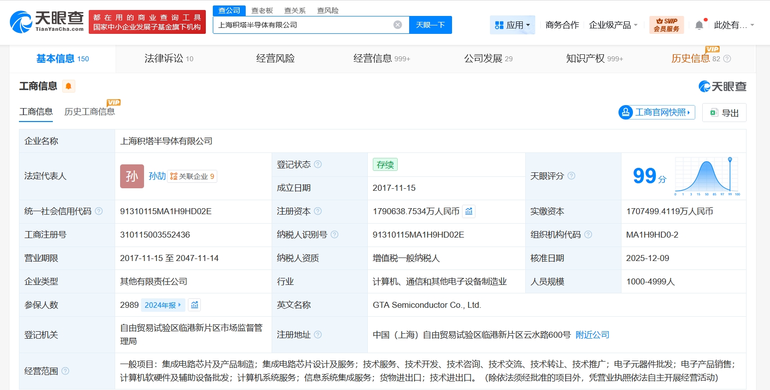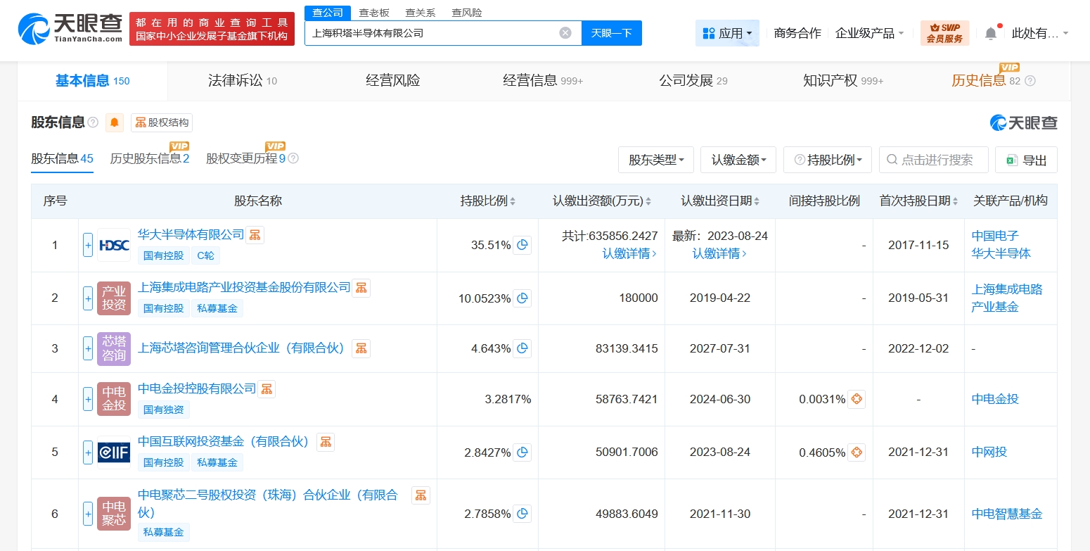 上海积塔半导体有限公司成立于2017年11月,法定代表人为孙劼,经营范围含集成电路芯片及产品制造、集成电路芯片设计及服务、电子元器件批发、电子产品销售、计算机软硬件及辅助设备批发、计算机系统服务、信息系统集成服务等。股东信息显示,该公司现由华大半导体有限公司、上海集成电路产业投资基金股份有限公司、中国互联网投资基金(有限合伙)及上述新增股东等共同持股。