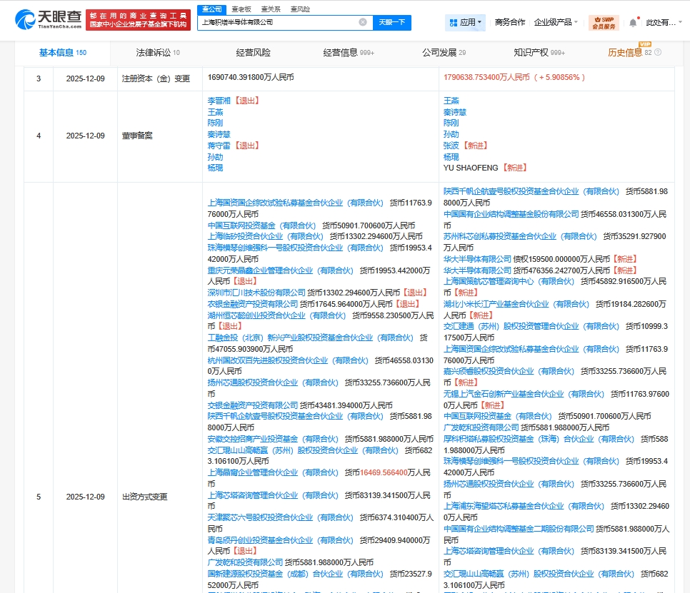 雷达财经讯,天眼查工商信息显示,近日,上海积塔半导体有限公司发生工商变更,新增中电金投控股有限公司、中电中金(厦门)智能产业股权投资基金合伙企业(有限合伙)、重庆中金科元私募股权投资基金合伙企业(有限合伙)等为股东,注册资本由约169亿人民币增至约179亿人民币,增幅约6%,同时,多位主要人员发生变更。